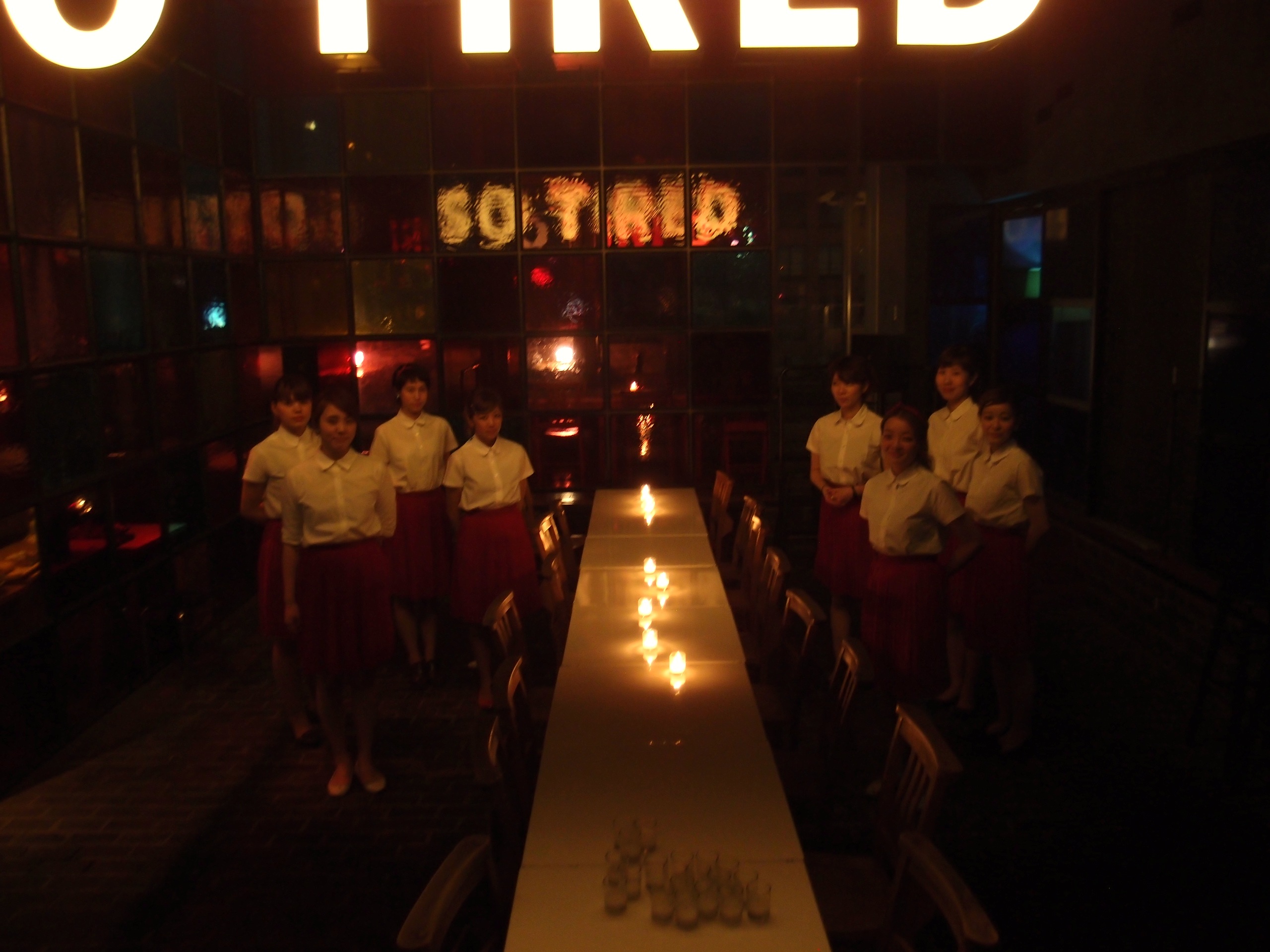 キャンドル、ギターの生演奏、暗がりを歩く8人のスタッフ。