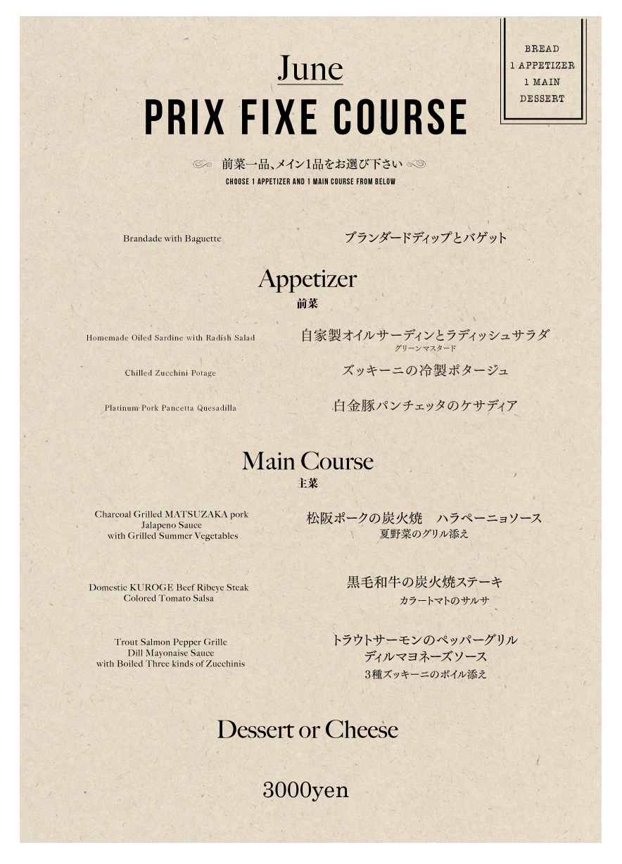 アーヴィングプレイス 6月のPRIX FIXEメニューです。