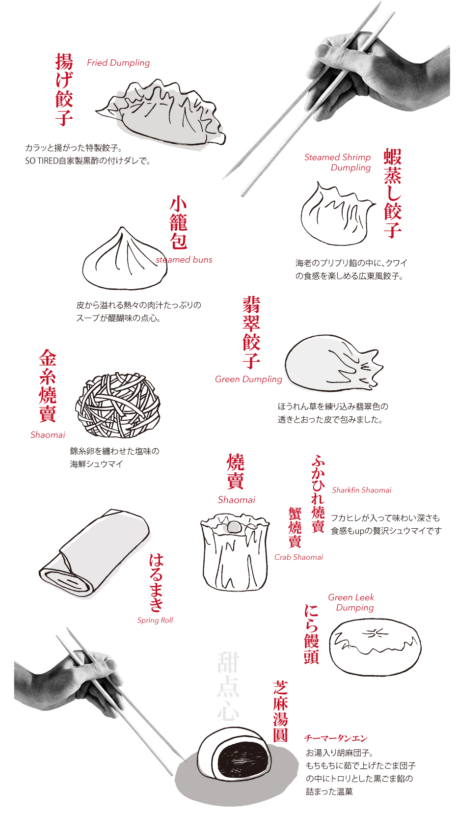 アメリカンと中華のダイニングSO TIREDには点心メニューが豊富に揃っています。