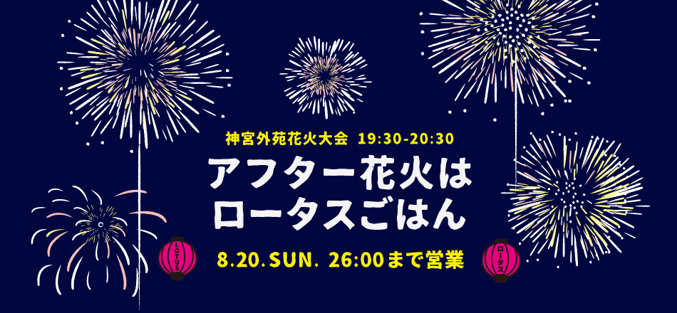今年も、神宮外苑花火大会当日はロータスの屋上を開放します